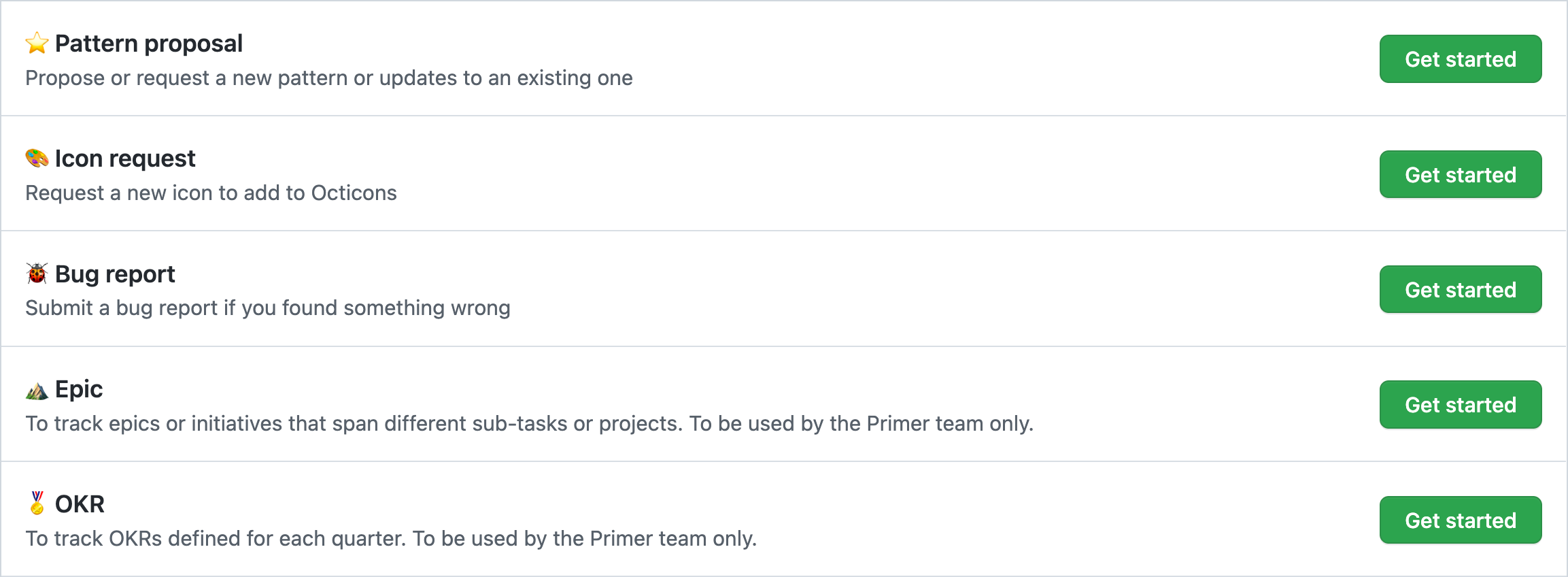 To address this issue, the “Get started” links can have the issue template's name appended to the end of the link's accessible name: