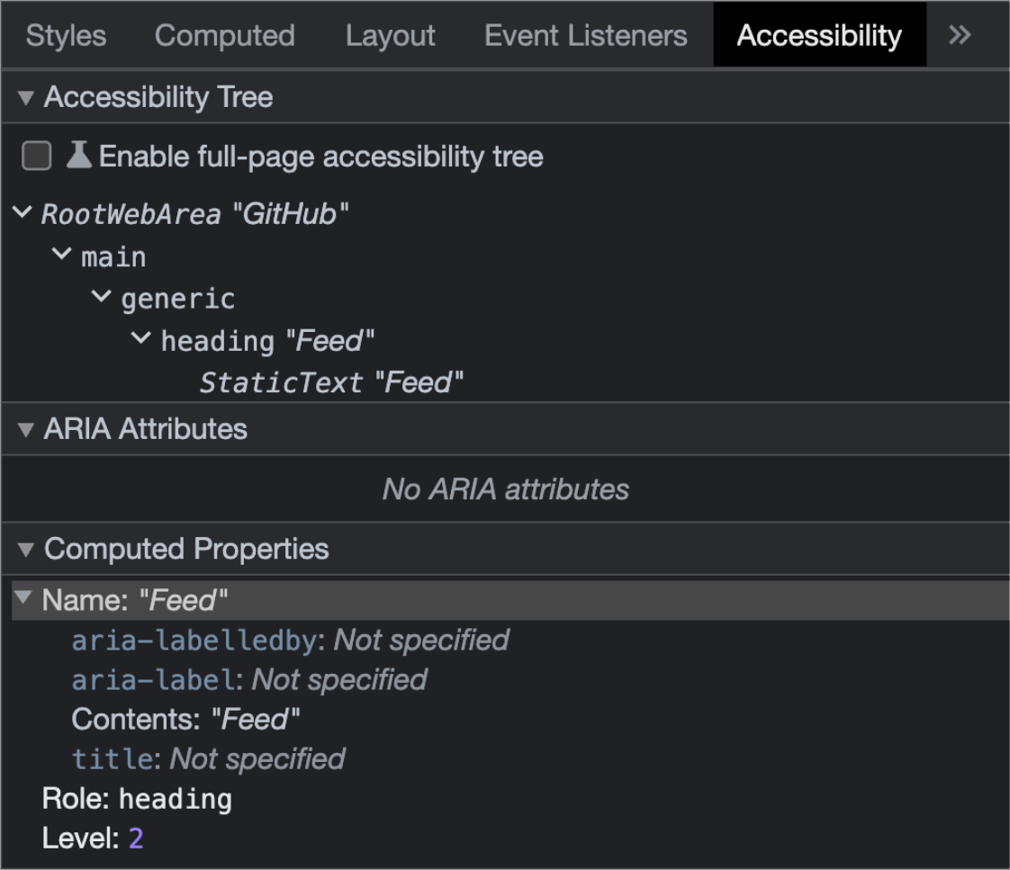For example, the “Feed” heading on the logged-in GitHub homepage uses a h2 element. Inspecting it will reveal a role of heading in the Accessibility inspector panel.